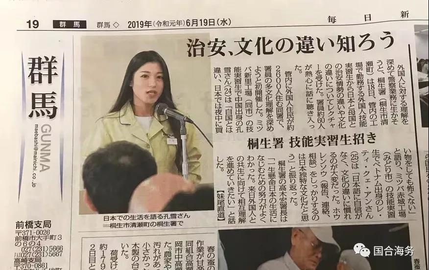 2019年6月18日,新里工廠的技能實習生代表孔雪于桐生警察署以“中日文化差異”為主題,為60多位日本警察做了演講。